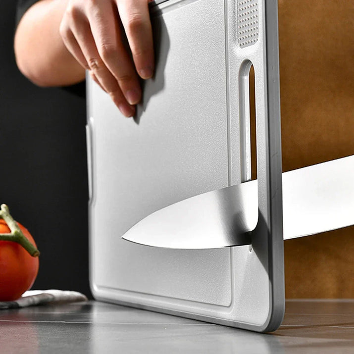 Answer 3: The cutting board is crafted from durable aluminum alloy, providing strength and longevity while maintaining an elegant design.